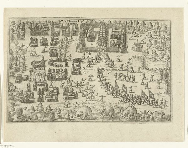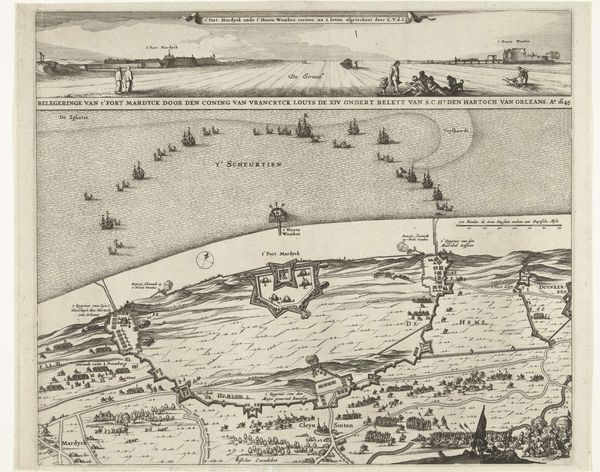 Curator: Here we have an early 17th-century print, "Kaart van de strijd in het hertogdom Gulik, 1614," currently residing here at the Rijksmuseum, attributed to an anonymous hand. What jumps out at you, Editor? Editor: It looks like the precursor to a modern infographic. But instantly cold, calculated…I feel like an ant, observing a macro-scale conflict from too far away to actually feel. Does that make sense? Curator: Perfectly. It's all about that overview, isn't it? The emphasis is on territory and resources. Note how the ink defines not only borders but also designates key fortified cities – tiny symbols of power, materially and politically. And the rendering of labor involved in war. Editor: Absolutely. The tiny, repetitive movements… look, it’s stylized of course, but those figures, all etched in miniature, enacting destruction. What do we know about this particular struggle? The War of… Curator: The Jülich Succession. Essentially, a dispute over who would inherit these strategic territories in the Holy Roman Empire. Notice the cannons, ships, and arranged military personnel. This was a proxy war in many respects, involving larger European powers jockeying for position, making claim for future holdings of key land Editor: It gives an unnerving detached feel doesn't it, to view conflict rendered so precisely. A battleground quantified almost like some agricultural product. But who do you imagine were its intended consumers, I wonder? The very elites directing from afar, presumably? Curator: Likely so. Though I suspect copies would have circulated amongst a wider literate population too. These images served a vital function as a news source as well. This blend of art, craft and strategic documentation feels uniquely of its time – what value beyond the purely informational do you perceive, if any? Editor: You know, despite the inherent remove – and despite it being commissioned as cold political capital, it retains something artistically naive, a handcrafted human essence. Seeing it laid out like this makes war seem all the more absurdly geometrical and cruel. Which sounds obvious written down – but is really communicated via this specific lens. Curator: A somber observation, fitting to a fraught and formative moment in Dutch and European history. Thank you. Editor: Thank you, this was enlightening. A strange mirror held up to history itself, via lines in ink.