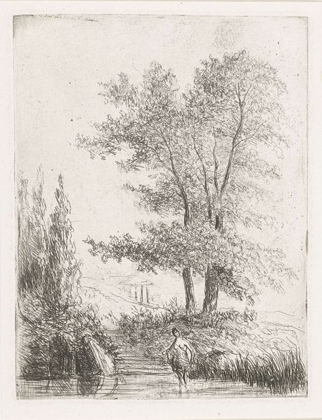 This is a landscape with two trees on a rock, made by Willem Matthias Jan van Dielen, using etching. This printmaking technique involves drawing an image with a needle on a metal plate covered with wax. The plate is then bathed in acid, which bites away the exposed lines. The deeper the lines, the more ink they hold, and the darker they appear in the final print. Notice the way the etched lines vary in thickness and density. Van Dielen uses this process to create a wide range of tones and textures, from the delicate foliage of the trees to the rough surface of the rocks. The etching technique allowed the artist to create multiple copies of his image, making it more accessible to a wider audience. It’s worth considering how the industrial processes involved in printmaking relate to wider social issues of labor, politics, and consumption. Van Dielen's landscape reminds us to appreciate the skill and artistry involved in this print, seeing it as both fine art and craft.