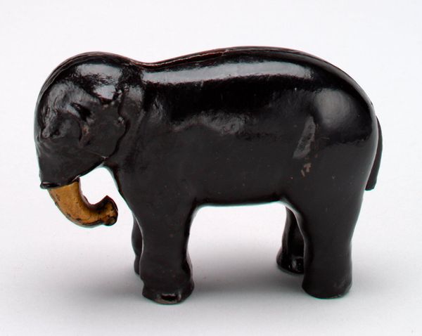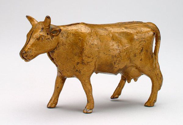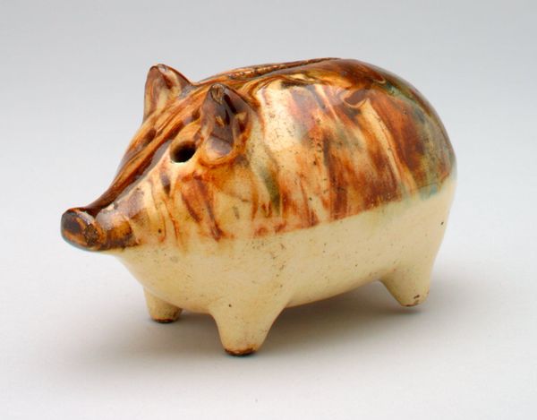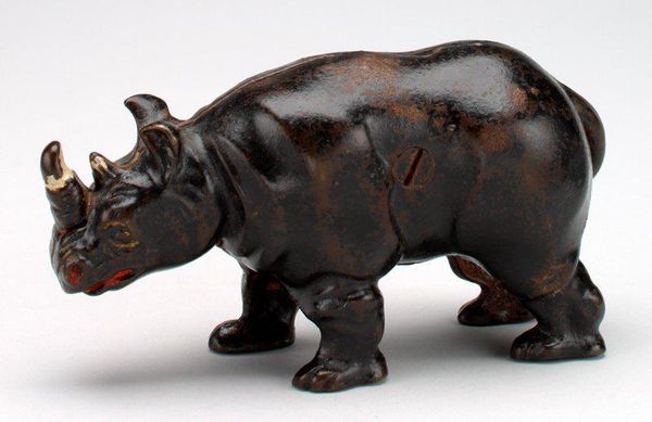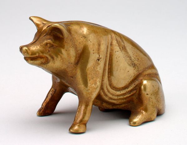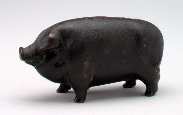 This little still bank, shaped like a pig, stamped with 'Decker's Iowana', is made from cast iron. I love how the anonymous maker embraces the material. It's got this mottled, rusty quality. You can tell it's been around the block, maybe held a few pennies. It's so simple, yet the surface is a map of time, like layers of sediment. Look at the way the light catches on its snout, those little imperfections in the iron, and how the word 'Iowana' is almost worn away. I'm reminded of the sculptor Isa Genzken, who uses found materials in her work, allowing the marks of time and use to become part of the piece. This piece is like a tiny monument to everyday life, the anonymous maker, Decker's Iowana, and even the little bits of money it once held. It makes you think about all the stories objects can tell, if we just take the time to look and listen.