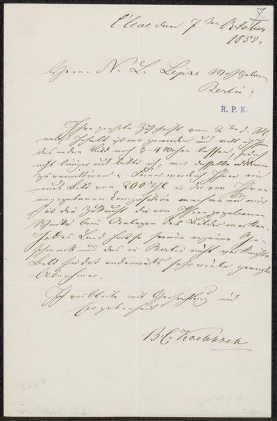 Curator: We’re looking at a fascinating artifact, a letter simply titled “Brief aan Philip Zilcken,” which translates to “Letter to Philip Zilcken.” The artist is none other than Mary Cassatt, and the date is given as between 1854 and 1926, corresponding with Cassatt’s life. The medium here is pen and ink, which provides insight into Cassatt's thoughts at that time. Editor: It's delicate, almost like glimpsing a private thought. The script is graceful but urgent, creating a sense of immediacy. The ink, now faded, speaks to the passage of time and makes me wonder who Philip Zilcken was and the nature of the communication. Curator: That's a good question. Philip Zilcken was a Dutch artist, critic, and writer, so there must be some sort of contact regarding the catalogue of artwork between them. And while Cassatt is best known as a painter and printmaker, she frequently used drawing as part of her artistic process. Correspondence like this shows an entirely different, more intimate dimension to Cassatt, particularly as she engaged with the art world. Editor: Exactly. Think about what this reveals about women artists and how they worked with galleries or how their pieces got exhibited in that period of history! Here we can see her speaking her mind. Even the casual nature of the pen-and-ink suggests a comfortable relationship—an insightful peek behind the curtain of a famous artist at work! It prompts questions about the support structures that facilitated Impressionism as a movement. Curator: Definitely. This unassuming piece becomes an important piece of art historical evidence! These seemingly small artifacts are what can broaden our view of art's role in its original setting. Editor: I think about the power dynamics inherent in these correspondences, the negotiations, the struggles to be seen and understood as a woman artist… Curator: Precisely. Studying objects such as these open possibilities and discussions concerning Cassatt's position, influence and work as an Impressionist. Editor: Looking closer here really helps me feel a stronger bond with an artist and an art movement I have loved all my life.