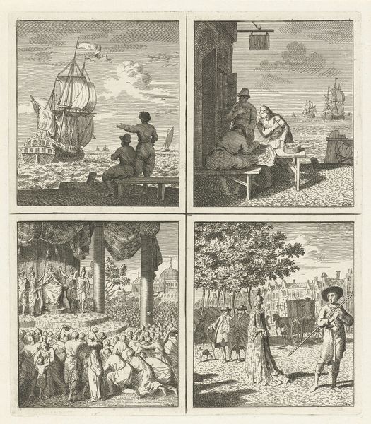 This undated print by Cornelis van Noorde depicts a series of scenes, each offering a glimpse into 18th-century Dutch life. These images offer a visual inventory of the Netherlands, inviting us to reflect on the social fabric of the time. Notice how the artist contrasts scenes of labor with those of leisure. In one panel, we see craftsmen at work, deeply engrossed in their tasks. In another panel, figures casually observe a fire, their body language relaxed and carefree. Below, a lone fisherman casts his line, while a fashionably dressed woman pauses, perhaps contemplating the scene before her. The presence of dogs in multiple panels adds a touch of domesticity. These scenes tell us about social hierarchy. Who is working and who is observing? And what does it mean to represent nature? It is through careful analysis of these kinds of scenes that we can begin to reconstruct the past. Looking at related prints, municipal records, and other historical documents, for example, helps to build a clearer picture of this era.