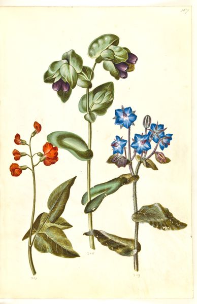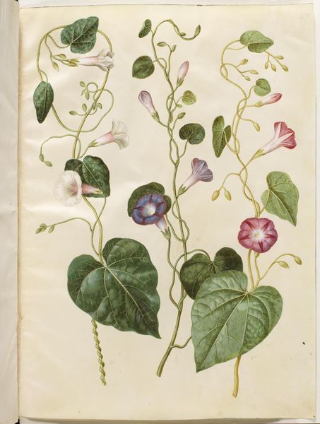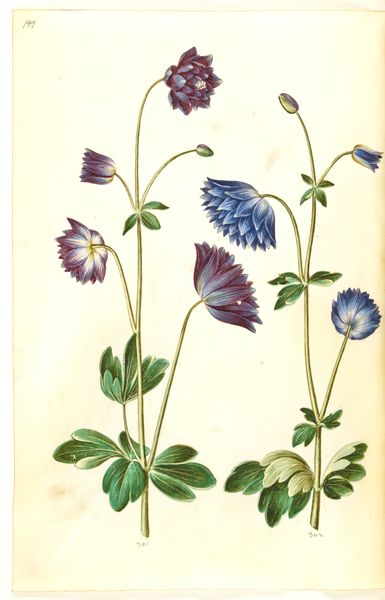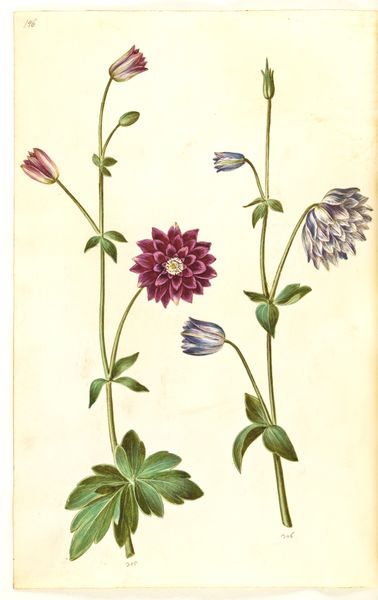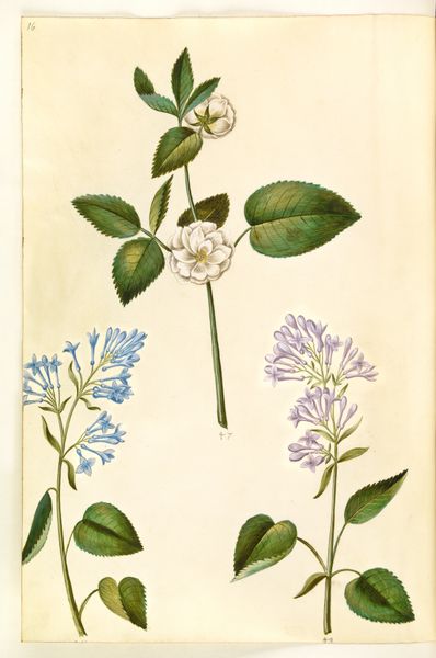 Curator: So delicate, aren't they? What captures your eye first when looking at this rendering of Anemone hepatica, also known as bl\u00e5 anemone? Hans Simon Holtzbecker captured it sometime between 1635 and 1664, using gouache and drawing techniques. Editor: Their quiet vibrancy is disarming. They feel almost like tiny portraits, each bloom subtly individualized. And the gouache gives them such a gentle, almost dreamlike quality. It is striking, too, that we have four instances here. Curator: Absolutely. The arrangement gives each of these flower variations its own space to be viewed with precision. We can compare not just colour but structure, veining on the leaves – little differences in the rendering of each plant, with a consistency of symbolism we can readily recognize in representations of spring. The bl\u00e5 anemone in particular is a symbol of anticipation. Editor: Ah, yes! Spring flowers – symbols of renewal, hope…the bittersweet understanding that beauty is often so fragile. The artist clearly captured that transient feeling so deftly. Did Holtzbecker’s audience at the time connect the flower with the same ideas that resonate today? Curator: In botanical art of this period, there's often a strong connection between a flower's appearance and its symbolic meanings. This was very much rooted in the cultural imagination and also the practical properties in some instances - Holtzbecker was documenting the world but also sharing something intrinsic to it. A potent combination. Editor: Thinking of it as a record as well as art unlocks so much! Now, the composition appears very meticulous, but there's still an inherent wildness... it feels real. Do you think the artist actively included any personal expressions into this supposedly straightforward art form? Curator: The very choice of subject, the meticulousness balanced with artistry – yes. Holtzbecker's choices themselves are deeply expressive, shaping not just what we see, but how we perceive and understand these resilient, hopeful blooms. Editor: It feels like so much is here. Seeing such beauty makes you wish it would go on for longer, exist somehow more tangibly. Curator: Perhaps in its being recorded with such fine detail, in a way it does go on...the bl\u00e5 anemone lives eternally through Holtzbecker's artistic sensibility.