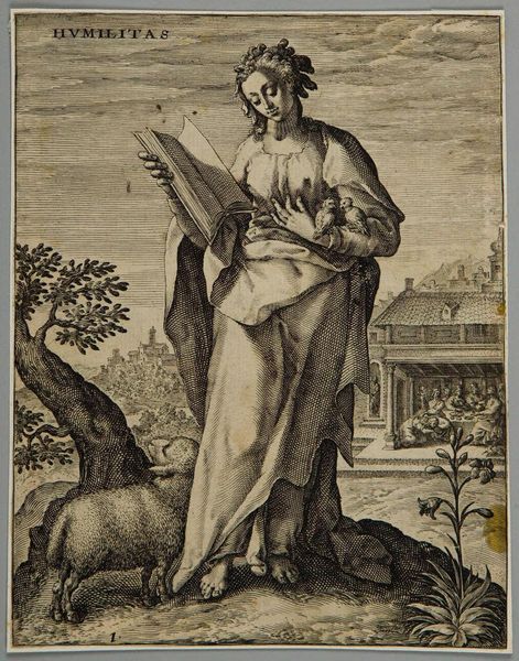 Curator: Here we have a sheet, approximately 18 by 14 centimeters, titled Faith, by an anonymous artist. Editor: I'm immediately drawn to the intricate hatching. It gives the whole piece a tangible, almost textile-like quality. Curator: Indeed. Note how the figure dominates the scene, holding a lamp and a book. It's intriguing how faith is visually linked to knowledge and enlightenment, especially considering the socio-political context of image production and reception. Editor: And look at the spinning wheel and the hen with chicks near her feet. It speaks to the labor and materials of daily life, contrasting the woman's more ethereal qualities. Curator: It is a fascinating juxtaposition, highlighting the tension between worldly concerns and spiritual conviction. The artist's message remains open to interpretation. Editor: Absolutely, it makes you think about the materials, their sources, and how they shape the meaning of the art. Curator: A point well made. Editor: A pleasure discussing this with you.