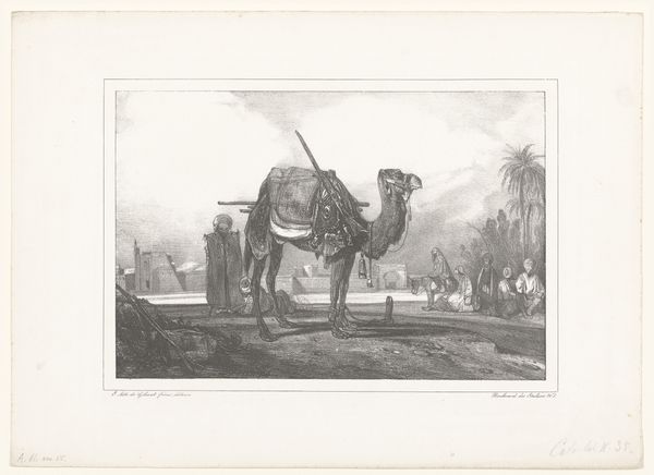 Curator: This print, titled "Kamelen," which translates to "Camels" in English, was created by August Le Gras in 1886. It appears to be graphite on paper. Editor: It's very quiet, isn't it? The grey scale and close-up composition evokes this heavy, humid feeling of desert stillness. Almost like waiting, with those imposing camels as the focal point. Curator: Yes, I think that stillness speaks volumes. Le Gras presents a snapshot of Orientalism through a Realist lens, very common at the time. You have these incredibly detailed camels alongside a resting figure. I think it hints at the socio-political dimensions of European interests in North Africa during the late 19th century. Editor: It's striking how he centers labor and rest. Is the relationship exploitative? Are they co-existing peacefully? Look at the blanket strewn carelessly to the left. Even it speaks of the human element as essential to the reading of the animals, doesn’t it? It gives the impression of waiting for a crossing of some sort. Curator: Absolutely, it demands interrogation! Consider the public’s fascination with these then “exotic” regions. Le Gras is depicting the world from a very specific Western perspective, framing labor and cultural exchange. His art operates as a crucial player in the creation of that cultural narrative. How much of that imagery promoted problematic colonial dynamics? Editor: The composition is simple but considered, and the attention to detail is remarkable. What do we know of its reception at the time? Curator: It would have likely been shown at salon exhibitions popular then, where it would contribute to popular understanding— or rather, misunderstanding, given colonialism at the time— of life in the Middle East and North Africa. I think it prompts us to critically reassess what "realism" meant when representing cultures and power dynamics through art. Editor: Right, so it's not just a neutral observation but a deliberate participation in shaping cultural understanding and, let's not forget, perpetuating power imbalances. Food for thought. Curator: Indeed, the "realism" is mediated, not direct. August Le Gras provides, in "Kamelen", an image deeply entrenched in the political and cultural atmosphere of its time and which is worth pondering now.