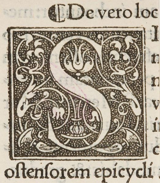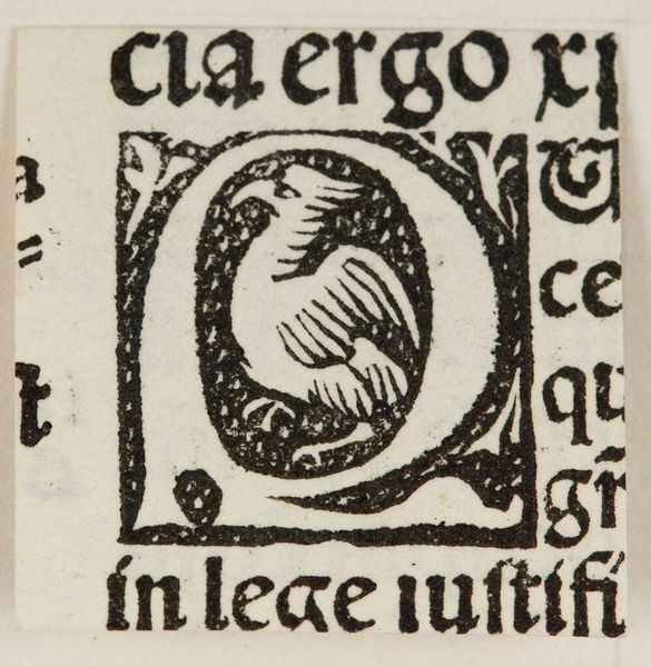 Editor: This is an anonymous woodcut, titled "Initial F (?),” from the Harvard Art Museums. The density of the black ink is striking. What do you see in this piece? Curator: The crude yet precise carving of the block creates an interesting interplay between positive and negative space. Observe the texture achieved through the varying widths of the lines forming the figure. Editor: I notice that the figure almost seems to blend in with the letter itself. Curator: Indeed. The artist is cleverly using the figural to define the letterform, thereby creating an intriguing visual tension. Editor: That's a perspective I hadn't considered. It's amazing how form dictates function here. Curator: Precisely. The beauty lies in how the visual elements coalesce into a unified whole.