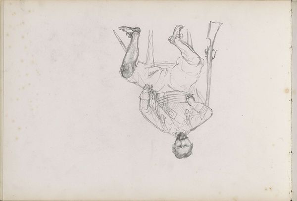 Editor: So, here we have Walter Shirlaw's "Study of Indian Riding," circa 1890, a graphite drawing. There's this raw, almost impulsive energy in the sketch – like a snapshot of a fleeting moment. What jumps out at you? Curator: Fleeting indeed! It’s as if Shirlaw caught a memory shimmering in the air, and wrestled it onto paper with a humble pencil. It makes me wonder, what's the story *behind* the study? Was it practice, a thought bubble during a more epic painting? Perhaps a window into the romanticized, though often skewed, visions of Native American life at that time. Do you see the implied motion? Editor: Yes, absolutely! The sketch feels dynamic even though it's just lines on paper. The rider is… well, they're *in media res*. What's interesting is that you don't see the horse at all, so you wonder if it's truly about 'riding' or more about portraying the figure itself. Is this just another "cowboys and Indians" trope? Curator: Exactly. We have to think about the context in which Shirlaw was operating – it's easy to slip into simple categories, but those loose, almost frantic lines, seem to tell me of someone actively figuring out *the figure*. Not in some cold academic way, but searching for the very *life* within. You sense a respect, a striving to capture something real. Now, maybe I'm being too generous – I often am, darling! – but art is about interpretation. Editor: That’s fair. And it makes you question your own biases too, right? I initially jumped to conclusions based on the title, but your point about "searching for life" makes me rethink how I view the work. Curator: See! It's not just looking, but a *dialogue* between our hearts and history itself. Never trust a simple reading! Editor: This makes me look at sketches in a different light from now on.