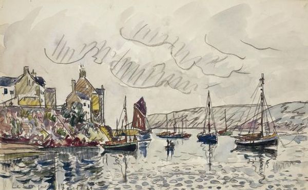 Editor: Paul Signac's watercolor "Antibes," created in 1917, depicts a vibrant harbor scene. The quick, fluid lines give the piece a sense of immediacy. How do you interpret this work within the context of its time? Curator: Considering this work, created during World War I, Signac presents a perspective far removed from the war's devastating realities. Do you see a deliberate choice here to portray leisure and beauty amidst a global conflict? It's almost an escapist view, particularly given Signac's position within Post-Impressionism, a movement already questioning societal norms and the purpose of art. The active brushstrokes create an environment devoid of the stark social commentary found in some contemporary art from that era. What could that signal, do you think? Editor: So, perhaps this is Signac making a political statement, not by showing the horrors of war, but by intentionally creating beauty in defiance of it? Curator: Precisely. By choosing to depict Antibes in this idyllic manner, Signac perhaps invites the viewer to reflect on what is worth preserving, even fighting for, during times of great upheaval. Furthermore, consider that harbor cities like Antibes, while seemingly removed from conflict, were crucial points of connection and sites deeply affected by broader political dynamics. Can we consider it an active choice? Editor: That's a perspective I hadn't considered before. It's fascinating how much historical and social context shapes our understanding of art. Curator: Absolutely. Thinking critically about the era, about Signac's aesthetic choices, and their cultural resonance provides so much context. Editor: It adds layers of meaning I wouldn't have seen otherwise. Thanks for helping me understand that!