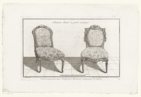 Editor: Here we have "French Chairs, in Chippendale Drawings, Vol. I," created by Thomas Chippendale in 1759. It’s a drawing, rendered in ink on paper. What strikes me immediately is the detail and the elegance suggested by these designs. How do you interpret this work? Curator: This drawing is less about furniture and more about the language of status, the symbolism of aspiration. Notice how Chippendale appropriates French Rococo motifs - the swirling lines, the delicate floral patterns. He presents them not as mere decoration, but as emblems of refined taste for his English clientele. Editor: Emblems? So the chair designs are meant to communicate something beyond their function? Curator: Precisely! Think of the hunt scene depicted on the one chair. What does the imagery of the hunter and prey evoke in you? It signals a leisure class, power over nature and perhaps even… others? The very act of acquiring such elaborate furnishings was a statement of social identity. Chippendale wasn't just designing chairs; he was crafting identities. Editor: That's fascinating. The chairs almost become characters in a larger narrative of wealth and class. The floral one also suggests something, though more domestic and pleasant. Curator: Indeed, floral motifs and patterns symbolize beauty, prosperity and fertility – all characteristics the chair owner might hope to connect to themselves by association. Chippendale was offering a vocabulary of symbols with which his patrons could articulate their place in the world. What do *you* think the enduring appeal of this visual vocabulary has been? Editor: I guess we still use objects to project an image, a desired self, just with different symbols now. Curator: Absolutely. Chippendale’s chairs reflect how symbols can create identity, how objects reflect culture. Editor: That's given me a whole new perspective. I see this work now as far more than just chair designs.