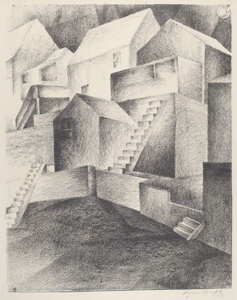 Editor: This is "Lower Manhattan," a 1930 drawing by George Ault. It looks like an etching, with these sharp lines forming a cityscape. It strikes me as very...stark. What do you see in this piece? Curator: Stark is a brilliant word for it! The Precisionist style really lends itself to that feeling. I see a city caught between aspiration and alienation. Look at how Ault renders those geometric forms; they’re almost painfully precise, right? It’s like he's dissecting the modern world with his pencil. Do you feel that separation, the way the buildings stand apart, even while forming a cohesive unit? Editor: I do see that. There's a feeling of… almost loneliness, despite being a cityscape, and even with the ships in the harbor. Curator: Precisely. The harbor suggests connection, sure, but notice the absence of human figures. We are offered only the machines of progress and industry, puffing out these ominous plumes. Ault lived through the Great Depression; do you think this reflects a skepticism of urban, industrial dreams of prosperity, maybe even a critique? Editor: It’s interesting to consider the historical context and to look at it that way. I hadn’t thought about the plumes from the ships that way—they definitely feel less optimistic now! I initially only interpreted it as purely visual, without symbolism. Curator: That’s the beauty of art, isn’t it? You bring your own interpretation, informed by your own experiences and knowledge. Ault might not have even been thinking any of that! And you have to wonder about his focus on light and shadow; is there maybe an expression of hope amidst the harsh angles? Editor: Definitely gives you something to think about. Thanks, this has been a very helpful perspective. Curator: My pleasure, hopefully Ault would approve!