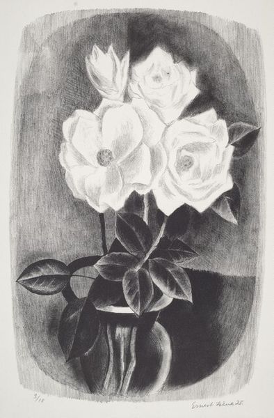 Pamela Bianco created this artwork, called "Holiday Greetings," using a stippling technique—a collection of tiny dots—to conjure up depth and form. I'm struck by the way the books and the flowers almost share the same weight; the objects are not quite there, but emerge slowly from the surface as if they've been conjured out of dust! Notice how Bianco's technique creates a very particular kind of light. It's almost as if the objects are illuminated from within rather than from any external source. My eye keeps being drawn to the way the light seems to catch on the glass, the density of dots creating a shimmering effect. Bianco's approach makes me think of Seurat but also the drawings of Agnes Martin, though in a different context. All three have an interest in breaking forms down into smaller elements, with each making a very specific kind of mark. Just as in Bianco's work, those marks have an effect on how the images are perceived. They create an environment of looking that allows our imaginations to roam freely.