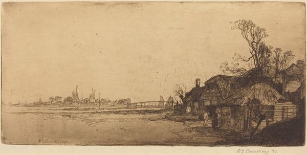 Curator: Ah, I feel a melancholy quietness radiating from this cityscape, almost like a faded memory. Editor: Indeed. This is "Wellfield House, Anderston" by David Young Cameron, created in 1891. It’s an etching, and intaglio print—a glimpse into late 19th-century urban life rendered with remarkable detail. Curator: The texture is incredible! It makes you want to run your hand across those aging facades. And that soft, brown patina… I wonder what it would be like to stroll along those streets myself. Editor: Consider how Cameron deployed etching. The lines are created through a labor-intensive process. Acid bites into a metal plate, painstakingly drawn upon. This allows for such detailed textures and that exquisite line variation. What social forces might be at play as etching emerged? Here you have the burgeoning middle class eager to display "high art" at reasonable costs as printmaking scaled in its popularity and distribution. Curator: The figures seem almost spectral, faded, yet anchored in their daily routines. Who were these ordinary people whose lives intersect in front of the building and shop? Are they inhabitants, merchants, or simply passersby? Editor: The etching technique does lend a sense of ethereality. It contrasts starkly with the permanence of stone. Note the compositional elements. The architecture dominates; people exist merely in support. A study of "the built" perhaps mirrors and affects the "unbuilt" aspects of human experience: human relationships, community ties, daily rituals of this time and place. Curator: Right. There is this beautiful symmetry broken subtly—imperfect human interaction softening the hard, angular world. You see lives unfolding despite the rigidity. I wonder what narratives were commonplace, hidden away behind brick and mortar? Editor: The use of intaglio contributes significantly to the print's perceived value. Each impression taken from the plate is made physical through the manual application of pressure. The artist mediates and participates in labor and consumption by using intaglio printing to enhance its worth. I like your sentiment concerning narrative possibilities, though! Curator: The work allows for such musings… What stories would Cameron say the etching has given to you if you were able to converse with him now? Editor: What began as documentation has become an artifact itself, speaking volumes about production, perception, and enduring historical witness. Curator: It makes you appreciate that every layer, whether consciously made or unintentional, is the piece's contribution.