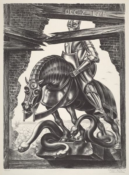This preliminary drawing, "Exodus Preliminary," by the 20th-century artist Michael C. Hayes, presents a scene dominated by sepia tones, lending it an aged, almost mythical quality. The arches receding into the background establish a rhythm of architectural forms. The rider on horseback, caught mid-motion, propels the composition forward. The textures of the stone architecture contrast with the smoother surfaces of the figures, highlighting the artist's attention to material specificity and surface. Hayes uses line and form to create a sense of depth, drawing the viewer into the scene. The formal arrangement here is less about narrative and more about the interplay of light and shadow. This could be interpreted through a semiotic lens, where the image functions as a sign, evoking notions of departure, passage, and perhaps even transformation. The artist destabilizes any fixed interpretation by emphasizing the formal qualities over a clear, linear storyline. Ultimately, it invites us to consider how the formal elements communicate broader cultural and philosophical ideas about change and transition.
