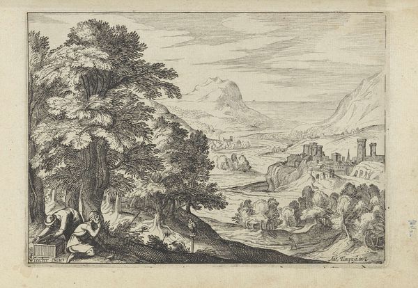 Curator: Looking at Paul Bril's "View of a Coast with a Keep or Lighthouse," executed sometime between 1564 and 1626, what strikes you first? Editor: Its overall somber tone. The sepia engraving is quite evocative, almost as if one were looking at an antique map with stylized coastlines, vessels, and crenellations. Curator: Bril created this image during a period of significant maritime expansion and conflict. The tower looms over a bustling harbor and serves as a vantage point but perhaps also represents the assertion of power in the face of rising overseas trade and the ever-present threat of invasion and resource exploitation. The plume from the tower connects us to the human aspect. Editor: From a formal perspective, the way he uses light and shadow is fascinating. The composition is skillfully balanced, with the dark, densely-etched tree on the left grounding the composition. He opposes that dark shape to the distant ethereal tonalities toward the right of the landscape and seascape. The sharp definition given to details and textures is stunning when you consider the medium and date. Curator: The harbor's activity can be seen through the lens of economic activity, class division, and geopolitical tension. Those boats signify not just trade but also potentially warfare or colonization. The land upon which the tower is situated could, from a feminist standpoint, also be interpreted as symbolizing power and domination over female nature. Editor: While that could be the case, for me the way that he captures and uses a relatively complex range of engraving marks across the image points toward a deeply refined engagement with printmaking as its own distinct artistic pursuit. This piece represents some clear semiotic markers—verticality and dominance of structure—which may speak to what you have said. But also it presents pure mastery. Curator: Bril masterfully weaves together aesthetic and historical threads. I appreciate your formalism and the insight you shared to understand his approach to engraving. Editor: Absolutely, thinking about those details reminds us of the layers of meanings we bring and how they change art over time.