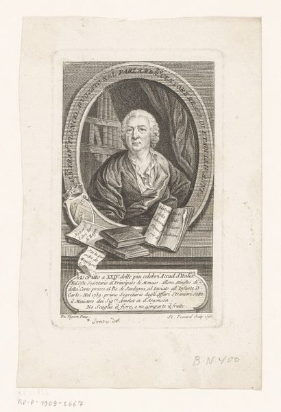 Editor: So, this is "Portret van Johann Ernst Schadaeus," an engraving from sometime between 1696 and 1720 by Johann Alexander Böner. The detail is amazing. I'm struck by the gravity of his expression and all the symbolism packed into such a small space. How do you interpret this work? Curator: Well, situated within its historical context, this portrait serves as more than just a likeness; it functions as a powerful statement of identity and status in the Baroque era. Böner's strategic choices emphasize Schadaeus's authority as a religious figure, which demands an examination of the era's rigid social hierarchies. Note the cross he holds, alongside books that signify theological knowledge; consider how they communicate not just religious devotion but intellectual and institutional power. What implications might this have given the ongoing religious and political conflicts of the time? Editor: That's interesting! So the cross and books aren’t just props, they’re tools to project a specific image. How does the text incorporated into the print factor into this reading? Curator: Exactly. The text beneath the portrait, Vere Herculis Scholastici vides umbram..., directly links Schadaeus to Hercules. What does this suggest about how Schadaeus, or perhaps Böner himself, wanted him to be perceived? It's likely not just a testament to his strength but also to his wisdom and virtue – essential qualities for someone holding religious and pedagogical authority. How do you think this comparison shapes our understanding of his role and the societal expectations placed upon him? Editor: It makes him almost…mythical. Like he's being presented as this larger-than-life figure, upholding intellectual and religious ideals in a turbulent time. It's all so deliberate! Curator: Precisely. And thinking about it further, we might also question the inherent biases within such depictions. Whose voices are amplified, and whose are silenced? This can help us to analyze whose stories are being told and from what perspective, leading to richer understandings about societal norms and power structures of that era. Editor: I never thought about it that way. Seeing it as a constructed narrative of power shifts my perspective completely. Curator: Absolutely. By considering these aspects, we begin to unravel the layers of meaning embedded within seemingly straightforward portraiture, revealing insights into the complex interplay of identity, power, and representation in the 17th and 18th centuries.
