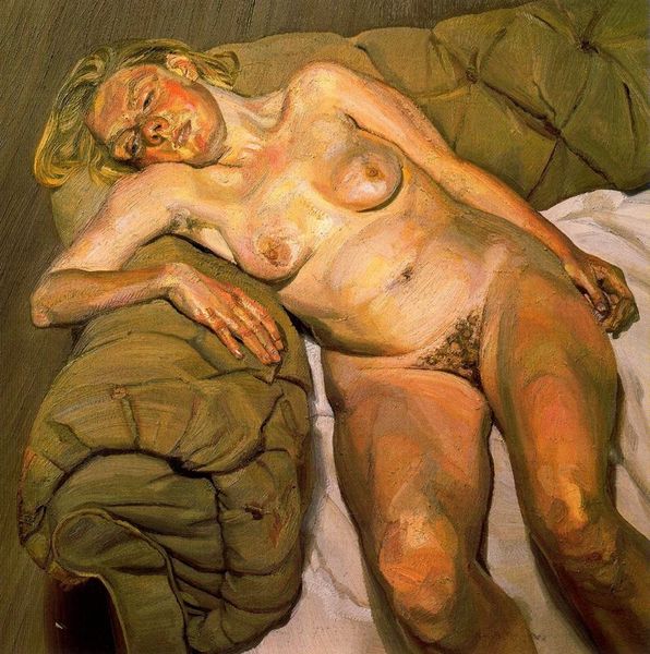Lucian Freud painted this nude portrait on canvas of a sleeping woman against a stark setting. Freud, whose family fled Nazi Germany and settled in Britain, emerged in a post-war world grappling with identity and the human condition. His portraits challenged idealized forms, emphasizing the raw reality of the human body. The woman’s relaxed pose suggests a moment of vulnerability, yet Freud's unflinching gaze avoids sentimentality. The intimacy of the scene evokes questions about power dynamics between artist and model, observer and observed, particularly in a male-dominated art world. Freud's rejection of traditional beauty standards reflects broader societal shifts towards embracing diverse representations of the body. "I paint people not because of what they are like, not exactly in spite of what they are like, but how they happen to be," Freud once said, capturing his focus on the accidental and authentic. This approach invites us to reflect on the complexities of seeing and being seen. The artwork serves as a mirror reflecting our own perceptions and preconceptions.