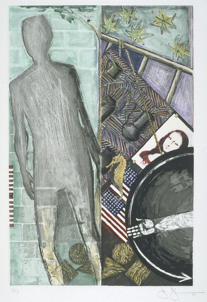 Jasper Johns made this trial proof for "The Seasons (Summer)" using etching and aquatint. It’s all about layering, not just of images, but of techniques, too. Look at the ghostlike figure on the left, with its subtle surface. It is built up from so many little marks. The surface feels scrubbed and worked, not smooth at all. And the colors – muted greens and grays – contribute to this sense of something remembered or half-seen. It feels like a process of excavation and collage, with elements emerging from the depths of the plate. The way Johns uses aquatint gives a grainy texture, like a memory fading in and out. The brickwork behind the figure feels solid, but the figure itself is ephemeral, transient. It reminds me a bit of Rauschenberg’s combines, this idea of bringing together disparate elements to create something new. It's like Johns is saying that art isn't about answers, but about the questions we ask along the way.