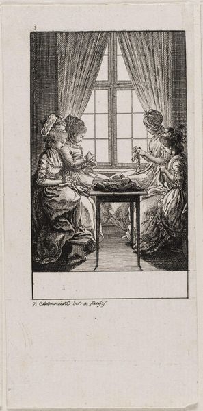 Louis Truchy created this engraving, "Pamela wordt tegengehouden op weg naar Mr. B.," in France sometime in the mid-18th century. It is after a scene in Samuel Richardson’s novel *Pamela*, which tells the story of a virtuous servant girl resisting the advances of her master. This image reflects the 18th-century French fascination with English literature, and more broadly with English culture. Novels like *Pamela* were controversial for their sympathetic depictions of the lower classes, and for portraying women as having interior lives of their own. In this print, we see an attempt to control the narrative of Pamela's virtue. The figures are sharply delineated, almost theatrical, reflecting the era's interest in moral clarity. Understanding the novel *Pamela*, along with the broader literary and cultural context of the time, is crucial to interpreting this engraving, so research into these areas would really help us to understand this artwork better.