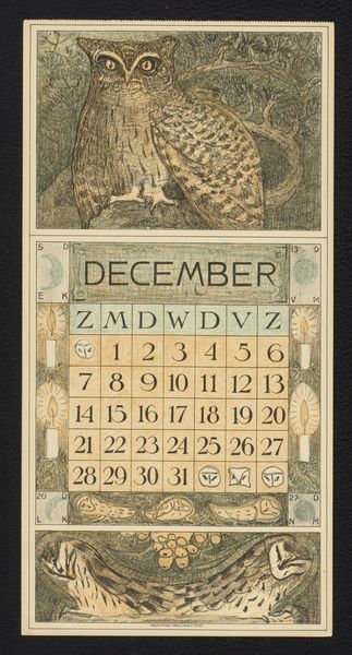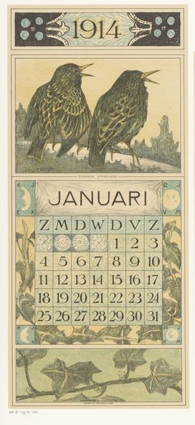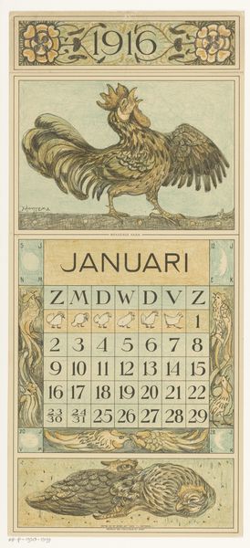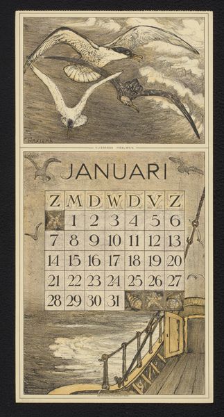 Editor: So, this is “Kalenderblad voor februari 1912 met meerkoeten,” or “Calendar Page for February 1912 with Coots,” a woodcut print by Theo van Hoytema from 1911. It’s at the Rijksmuseum. I’m really struck by the composition—the top panel with the coots in a marsh feels so different from the Art Nouveau calendar design below, almost like two different artworks combined. What do you make of this juxtaposition? Curator: Oh, isn't it charming? It makes me think about time—our measured, organized existence laid bare, juxtaposed with the wild abandon of nature. Van Hoytema had such a tender, intimate view of the Dutch landscape, didn’t he? The coots seem engaged in their own dramas, utterly indifferent to our human obsession with marking the days. And the Art Nouveau calendar below… It feels very decorative, almost theatrical, in its presentation of the mundane. Don't you find that fascinating? Editor: I do! The coots really feel like characters; it almost makes you wonder what they're arguing about. I love that you see the calendar as theatrical, though. Do you think Hoytema was making a statement about our relationship with nature by putting them together like this? Curator: It’s certainly food for thought, isn’t it? Perhaps he wanted us to consider how our human constructs—like calendars and timekeeping—both celebrate and simultaneously distance us from the natural world. The placement feels deliberate. What do you think is accomplished by placing the relatively calm marsh view on the top of the work? Editor: Good point. Perhaps putting nature “above” suggests its primary importance to life or reminds viewers of something bigger than themselves and human concerns. Now that I consider it further, Hoytema did have a point to make after all! Thanks. Curator: Exactly. See how a simple calendar page can become such a deep well of contemplation? That's the beauty of art, I think.