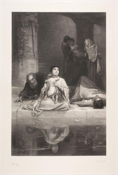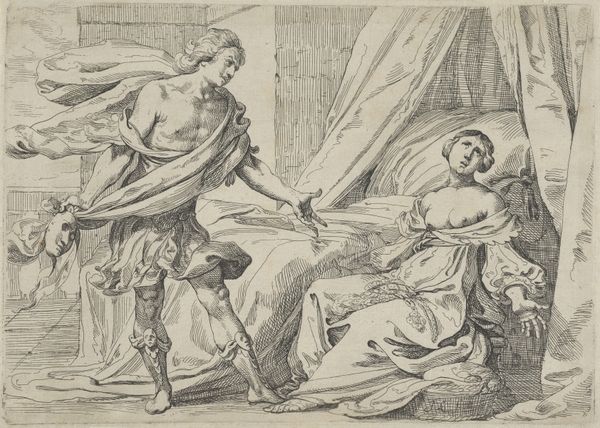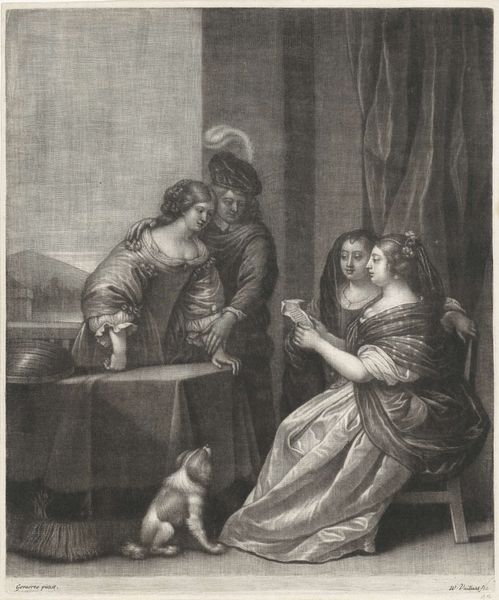 Curator: This is George Clint’s "Falstaff’s Assignation with Mrs Ford," currently residing at the Tate Collections. It captures a scene rife with tension and anticipation. Editor: My first impression is one of unease, a sense of something not quite right. Mrs. Ford seems burdened, not joyous, despite the suggestive title. Curator: The work draws upon Shakespeare's "The Merry Wives of Windsor", a comedy that, within its social context, played with anxieties around class and reputation. Clint’s illustration, in this light, feels almost subversive. Editor: Note the goldfish bowl, a symbol of entrapment and fleeting beauty. The gaze of Mrs Ford seems very much locked to the goldfish within. Curator: Absolutely, and we can also examine the placement of the screen, the concealed Falstaff, the power dynamics at play within the burgeoning middle class, eager to mimic aristocratic pastimes and manners. Editor: It's as if Clint captured a moment where societal expectations and personal desires collide, leaving a residue of discomfort. Curator: Indeed, it prompts consideration of how artistic renderings influence our understanding of literature and social decorum. Editor: A fascinating intersection of text and image, revealing hidden depths in a seemingly lighthearted tale.
