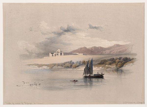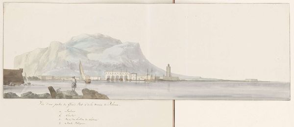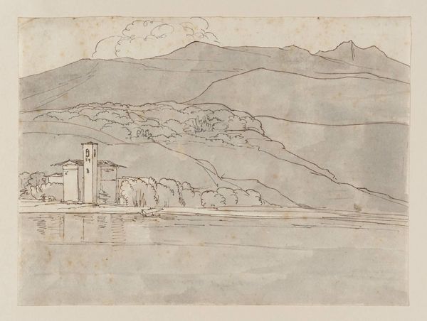 Curator: Isaac Pocock's "Taken from below the Ferry, Anglesea" presents a serene coastal view. It's rendered on a support measuring 160 by 273 millimeters. Editor: It feels so delicate, almost ephemeral. The soft washes of color give it an airy quality. Curator: Pocock, active in the late 18th and early 19th centuries, lived through a period of intense naval conflict. He began as a seaman, so this depiction can be read as an extension of his experience. Editor: The subtle gradations of tone are quite striking. It's easy to forget how labor-intensive watercolors can be, the careful layering. Curator: Absolutely. And consider the social context: maritime scenes often served to project British power and commercial interests. Yet, here, it feels more subdued. The figures are in shadow, rendered as part of the overall landscape. Editor: I'm struck by how much the materiality contributes to this feeling. The water, hills, and buildings all seem to breathe. Curator: A compelling reminder that art can be both product and reflection of its time. Editor: It’s fascinating how the artist’s life and historical context intertwine with the watercolor's physical properties.