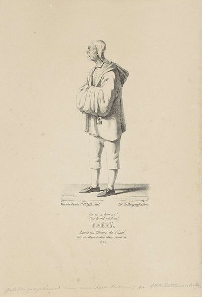 Editor: This drawing, “Man met hand in zijn jaszak,” or "Man with Hand in His Pocket," was created in 1828. It's ink on paper, and signed by Anthonie Willem Hendrik Nolthenius de Man. There's a contemplative stillness to the subject's posture, wouldn't you say? What significance might you find in such an everyday portrayal? Curator: Indeed. He embodies a figure caught between worlds. The hand in the pocket; isn't that an emblem of withheld intention, a sign of reticence? Look at the period clothing; they suggest a rootedness in tradition, yet his casual pose hints at a quiet rebellion against formality. Does this resonate with you? Editor: I see what you mean. It's like he's participating in societal expectations while subtly distancing himself. How would this piece relate to the art world in the 1820s? Curator: The tension you observe speaks to the Romantic era’s fascination with the individual amidst societal change. Remember, this was a time when the inner emotional life gained importance. The man's concealed hand, therefore, isn’t just a detail, but a potent symbol of self-containment. Don't you feel that it encapsulates the broader anxieties of the period? Editor: It's like the picture is referencing this societal transition and anxieties by keeping emotions hidden, portraying internal reflection, through something as simple as putting your hand in a pocket! I'm going to start paying closer attention to details like that. Thank you. Curator: A rewarding path opens when we decode the language of symbols. They carry our shared history. I, too, appreciate learning something new during this conversation.