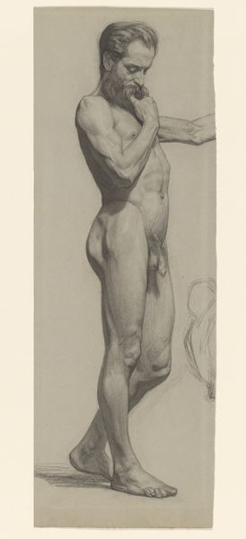 Victor Müller rendered this male nude study with pencil, capturing a figure that echoes classical ideals, yet carries a distinct emotional weight. The pose, with one foot elevated on a pedestal, recalls ancient Greek sculptures, symbols of masculine strength and civic virtue. However, Müller's treatment diverges. The figure's arm is drawn across his chest, a gesture reminiscent of introspection or self-reflection. We see this motif echoed through time, from Renaissance depictions of melancholic saints to modern expressions of existential angst. This gesture, deeply embedded in our collective visual memory, speaks to a profound awareness of self. The emotional power of this image lies in the tension between classical form and introspective gesture. It engages us, resonating with our subconscious understanding of strength, vulnerability, and the enduring human quest for self-understanding. Müller's figure reminds us that symbols evolve, carrying echoes of the past while reflecting the present.