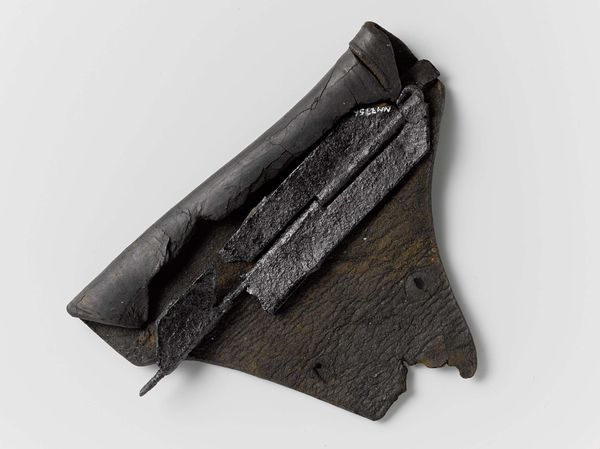 Editor: This object, entitled "Stuk leer, vermoedelijk in de vorm van een nog niet opgemaakte voorschoen"—or "Piece of leather, presumably in the shape of an unmade front shoe"—is dated to around 1590-1596, and resides here at the Rijksmuseum. It appears to be made of treated wood. It’s…surprisingly captivating for a scrap of leather. What do you see in this piece? Curator: I see a fragmented narrative, a ghost of utility. The form itself, while seemingly simple, whispers of the craft and care embedded in even the most mundane objects of daily life centuries ago. It is suggestive, not declarative, offering itself up to many potential stories. Can you sense the cultural memory held within this shape? Editor: Cultural memory? That sounds intriguing. I guess I was focused on the texture and shape more than anything else. I was thinking about how different shoes were back then. Curator: Exactly! The shoe, throughout history, hasn't merely been a practical object. It’s a potent symbol. Consider the power associated with shoes in various cultures, from Cinderella’s slipper to the act of walking in another's shoes to gain empathy. Even the act of leaving shoes outside a sacred space. Does this fragment evoke any of that for you? Editor: Now that you mention it, there is something evocative about a shoe… especially one that never got finished. It makes you wonder about the person who would have worn it and what their life was like. Almost like an incomplete story, right? Curator: Precisely. The unfinished nature heightens its symbolic power. It invites us to complete the narrative, to project our own understanding of the past onto this object. We fill the void and walk in their shoes. Editor: This has made me think of this humble shoe in a new light, like it holds so many other stories just waiting to be uncovered. Thanks for your insight! Curator: My pleasure. It's amazing how even the simplest object can unlock such rich layers of meaning.