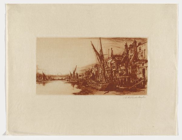 Editor: This is "Uithangende visnetten," or "Hanging Fishing Nets," by Peter Henry Emerson, sometime between 1890 and 1895. It's a gelatin silver print. The hazy quality makes the scene feel melancholic, almost like a faded memory. What do you see in this piece, beyond the surface level? Curator: Immediately, the nets themselves strike me as potent symbols. Throughout history, nets represent trapping, vulnerability, but also sustenance and provision. Think of Saint Peter, the fisherman. Do these nets feel empty or full of potential to you? Editor: I see both, maybe. Empty now, but holding the promise of a future catch. The windmill in the background seems like a symbol of industriousness too, right? Curator: Absolutely. The windmill carries echoes of Dutch Golden Age painting, invoking a specific sense of place and time. But it's not just about literal representation; Emerson was part of the Pictorialist movement. Consider the soft focus, the blurring of details...What feelings does that evoke for you? Editor: A sense of fleeting time. Like a moment captured but already slipping away. Curator: Precisely. The Pictorialists were less interested in documentary photography and more invested in creating an emotional atmosphere, aiming to elevate photography to the level of art, on par with painting. Do you see connections to Impressionism in the work? Editor: Yes, especially in the emphasis on light and atmosphere, dissolving forms into hazy shapes. I never really thought about the layers of symbolism inherent in something as simple as fishing nets before. Curator: These everyday objects accumulate meaning over time. Paying attention to them offers a lens to the values, dreams, and anxieties of a culture. Editor: I’ll definitely look at seemingly simple scenes differently from now on! Curator: Wonderful. It seems we’ve both caught something in our net today.