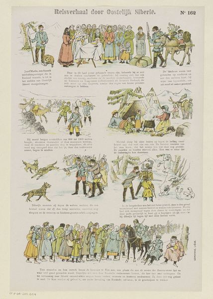 Curator: Welcome. Here we have “Arme August,” or “Poor August,” by Monogrammist JGr, dating from between 1894 and 1959. It's a print currently held at the Rijksmuseum. What do you make of it at first glance? Editor: A sequence of escalating silliness! Each frame bubbling with awkwardness, pratfalls, a symphony of mishaps. The clown figure, the so-called "August," seems to trigger every conceivable disaster. Curator: Absolutely. What strikes me is the almost industrial production of humor here. Look at the uniformity of the panels, the deliberate repetition of figures, the sense of a manufactured comic narrative. Editor: Manufactured, maybe, but also deeply felt. The figure tumbles through each scenario like a stand-in for our own stumbles through life, his oversized trousers practically begging to trip him up again and again! There's something empathetic about that endless cycle of error. Curator: And yet, there’s also the suggestion of control and social commentary woven in. Notice the omnipresence of the authority figure, almost a ringmaster character, supervising, occasionally intervening. The "poor August" is forever caught between the whims of fate and structured social command. The means of production, of control, in laughter. Editor: Perhaps, but there's a beautiful rebellion, a "carnivalesque" spirit. He keeps getting up. The narrative, in spite of those little dramas of class friction, leans ultimately toward something affirmative and joyful. Curator: I can agree that it has a buoyancy. Perhaps the print, through its repetition and comic style, reflects a social appetite for consistent, predictable amusement—a way of processing, in an undemanding, iterative fashion, a social order in change? Editor: Or maybe just an invitation to laugh at ourselves, reflected in the awkward antics of "Arme August." Either way, I appreciate this little monument to the perpetual pratfall.