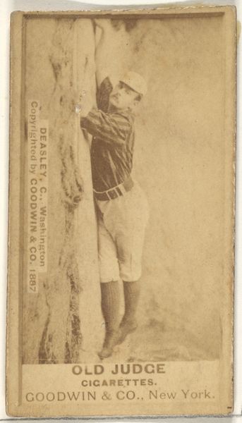This small photographic print, dating from the late 1880s, was made by Goodwin & Company as a promotional item for Old Judge Cigarettes. The image is printed on paper, a mass-produced material that lent itself to wide distribution. The photograph pictures Al Maul, a pitcher for Pittsburgh, in his baseball uniform, as a way to connect the popular sport of baseball with the consumption of cigarettes. The card was made through a highly industrialized process, where photography and printing technologies were used to reproduce the image on a mass scale. This was a clever marketing ploy: by including these cards in cigarette packs, the company was hoping to increase its sales. It is interesting how the image captures the intersection of labor and leisure in late 19th-century America. The production of the card itself involved industrial labor, while the image promoted leisure activities like baseball and smoking. By examining the materials and making of this card, we can gain insight into the social and economic dynamics of the time, blurring the lines between commerce, sport, and daily life.