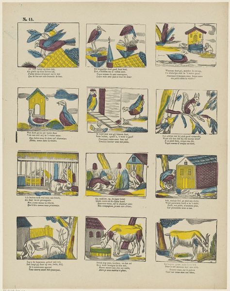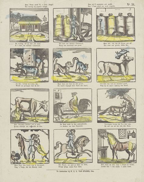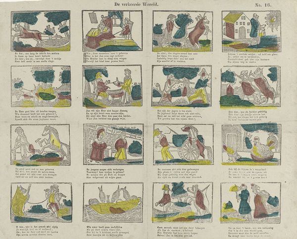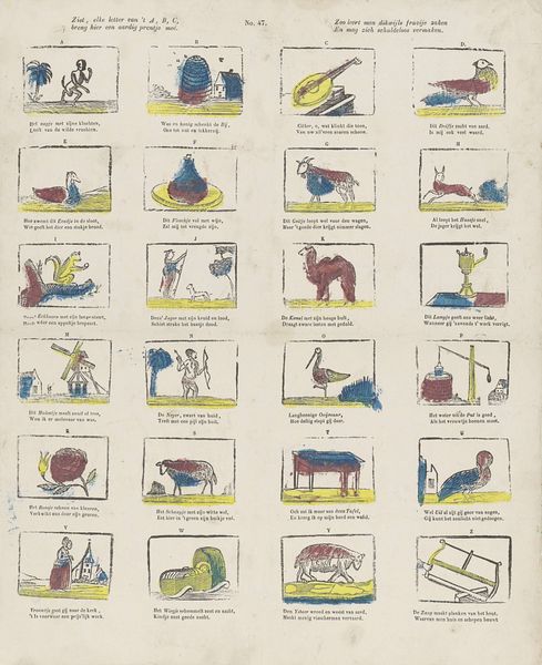 Curator: This fascinating print, attributed to Lutkie & Cranenburg and held here at the Rijksmuseum, dates from sometime between 1848 and 1881. The lengthy title translates roughly to “Wilt in your young days, yet gladly, zealously learn." It’s an engraving filled with little narrative vignettes. What strikes you first about it? Editor: Immediately, it’s the compartmentalization, almost like a series of tarot cards, each telling a small story within the larger frame. The simple coloring and line work give it a naïve, folk-art feel, but there’s an undercurrent of...warning, almost? Curator: Interesting observation. We might consider this within the broader context of educational prints popular during that era. Each vignette is indeed a miniature scene, often with a moral lesson or proverb, aiming to instruct the youth, likely a commentary on labour and values. We might explore how print culture shaped the dissemination of ideology within expanding bourgeois communities. Editor: Precisely. Thinking intersectionally, we must acknowledge the work is explicitly engaging ideas of power—who benefits, and who is exploited within systems? Consider how themes of industriousness or the "proper" use of time serve those who controlled capital during this period, and what lessons they want to engrave in the young generation. It prompts the critical question: Education for whom, and for what purpose? Curator: That lens allows us to investigate further into these seemingly benign images, connecting the folk-art charm to its underlying societal role. Do these simplistic depictions reinforce the status quo? Editor: Absolutely, it becomes a reflection on structures—familial, educational, economic—and it gives those with a strong investment in keeping those structures intact another opportunity to indoctrinate society’s younger members. By prompting us to examine these visuals through diverse theoretical viewpoints, it highlights power, knowledge, and social construction. Curator: Exactly! So, what initially seemed like an innocent children's print becomes a microcosm of 19th-century Dutch society. Editor: In retrospect, examining this folk piece, which seems innocuous at first glance, has illuminated how the values and educational paradigms imposed on individuals may impact generations and the evolution of societal values.