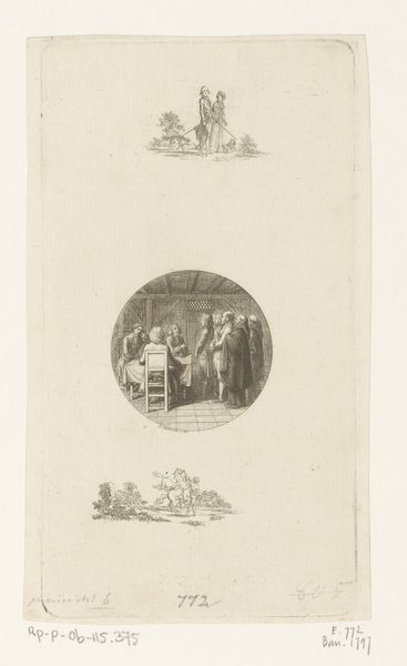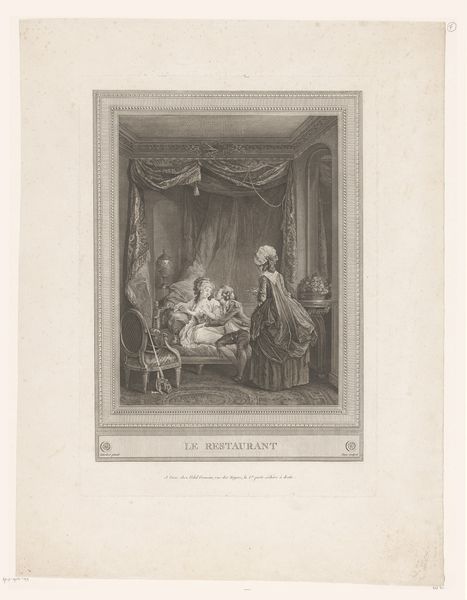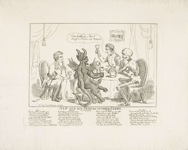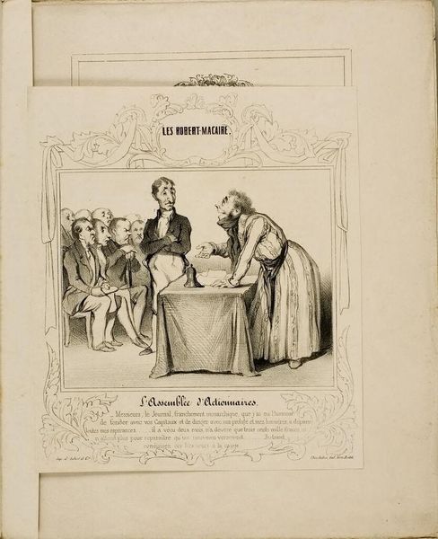 Curator: Daumier's "Robert Macaire, Intelligence Agent" is a lithograph—part of a series satirizing the bourgeoisie in 19th century France. It's currently held at the Harvard Art Museums. Editor: It's immediately striking how cynical this image feels. The smug agent, the desperate client… you can practically smell the corruption. Curator: Exactly. Daumier was deeply critical of the July Monarchy and its rampant financial speculation, portraying Macaire as the embodiment of unscrupulous entrepreneurship. Editor: And the woman's body language—so submissive, almost pleading. It speaks volumes about the power dynamics at play, not just in business but in society as a whole. Curator: Daumier's work was often considered politically charged, leading to censorship and even imprisonment at times. This piece shows how art can act as social commentary. Editor: It's a potent reminder of the ways in which art can challenge and critique power structures, something that still resonates so profoundly today.