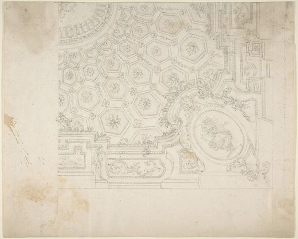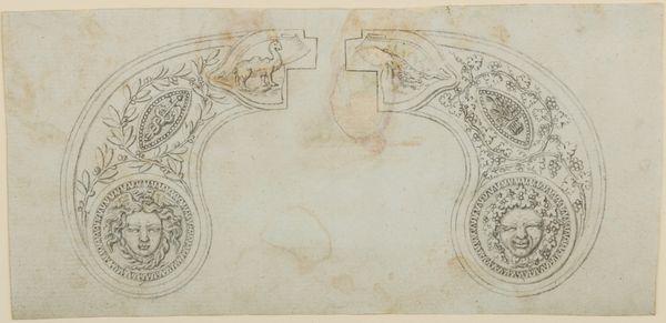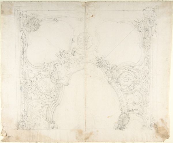 Curator: Here we have Giovanni Cambiaso's "Twee ontwerpen voor een wandschildering," or "Two Designs for a Wall Painting," created sometime between 1505 and 1579. The medium is pencil and possibly watercolor. Editor: My first impression is of elegant constraint. The designs feel both ornate and unfinished, leaving space for the viewer to imagine the textures and final form of the intended mural. There is definitely a muted, almost ethereal quality to the artwork as a whole. Curator: Indeed. I see a negotiation between secular display and humanist sensibilities. The design on the left seems to echo a stylized escutcheon. This hints at familial pride and a longing for prestige, all common concerns within the social fabric of Renaissance Italy. Editor: Speaking of materials and production, I wonder what kind of pigment was initially envisioned for this wall painting, and whether it was eventually completed based on these designs. What specific local sources or imported goods might have determined the eventual coloration and material expression? Curator: It is easy to imagine lapis lazuli making an appearance, and I note in the design on the right, that the central, framed landscape has architectural elements which serve to represent the ideal city of the Renaissance, imbued with values of civic harmony and reasoned thought. Editor: This image really underscores the division of labor in Renaissance art. How many artisans and workshops were involved in translating these delicate drawings into large-scale, enduring public works? Curator: It reminds us of the collaborative aspect inherent in realizing grand artistic visions within hierarchical workshops, also reflecting the artist's dependence on both patronage and the availability of resources. Editor: Reflecting on the materiality and the symbols, it adds depth to the ways we see consumption practices. This offers insight into an elaborate process of patronage during the Renaissance. Curator: A look into enduring visual vocabularies of aspiration in the 16th century. Editor: Precisely! These muted pencil lines suggest both the promise and the hard work required to bring grand visions into tangible reality.