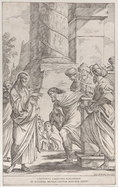 Curator: This engraving, dating roughly from 1729 to 1740, presents "The Pentecost" with the Apostles and the Virgin. It’s presently held at The Metropolitan Museum of Art. Editor: My immediate feeling is one of hushed anticipation, like holding my breath just before a major event. The swirling lines radiating from the dove certainly amplify the dramatic tension. Curator: Precisely. It’s an engraving by Frédéric Horthemels after Gaudentio Ferrari. The architecture has this interesting tension between the Roman-inspired arches and something resembling a stage. Horthemels lived and worked during the period of Louis XIV, known for promoting centralized royal power. Editor: Power that very conspicuously comes from above in this composition. Notice how the dove, representing the Holy Spirit, literally floods the gathering with divine light. I think Horthemels manages to subtly interrogate the very *concept* of institutional authority and sacred power, showing how deeply infused the political climate was within sacred life. It almost looks like a spotlight. Curator: I agree. The work certainly illustrates the influence of power on both the creator and the consumers of the work. But, beyond just the sociopolitical implications of religious imagery, Horthemels also seemed interested in documenting collections, almost archiving. In 18th century France, engravings had that function for collectors: this rendering after Gaudenzio Ferrari’s original painting became a stand-in or simulacrum, but one available for much wider distribution and viewing. Editor: So, it wasn't necessarily about capturing some spiritual essence, but more about cataloging art, and disseminating the experience of art to new audiences beyond wealthy patrons. Is it fair to suggest this accessibility, even if through prints, had democratic underpinnings? It seems significant given the historical era. Curator: A provocative thought! By widening the circle of engagement, new kinds of spectatorship emerge— potentially shifting the understanding of who is privileged to experience the "divine", as expressed through artistic expression. Thank you for your insight. Editor: My pleasure, seeing familiar narratives with fresh eyes is something art excels at!