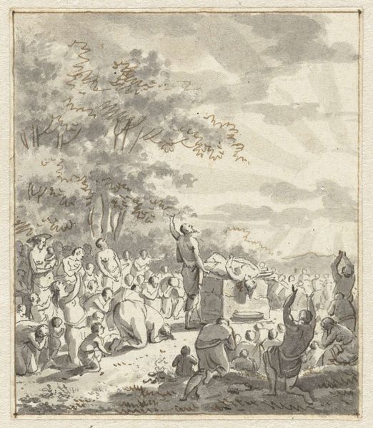 This drawing, "Graflegging," was made by Jan Goeree around 1700 with pen in grey ink, and brush in grey and brown ink. The composition is striking: The foreground shows detailed figures escorting the viewer's gaze towards a crowded scene in the background. The monochromatic palette, primarily shades of grey, lends a somber, reflective mood. Goeree's use of line is particularly noteworthy. Notice how the fine, detailed lines in the foreground contrast with the looser, sketchier strokes in the background, creating a sense of depth and distance. The drawing prompts an inquiry into how Goeree uses these formal elements to structure not just the visual space but also our understanding of the scene. The semiotic elements—figures, architecture, and symbols—invite us to decode their meanings. It challenges us to look beyond the surface to engage with broader philosophical concerns about life, death, and the structures that govern our understanding of the world.