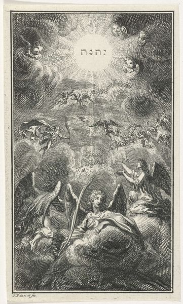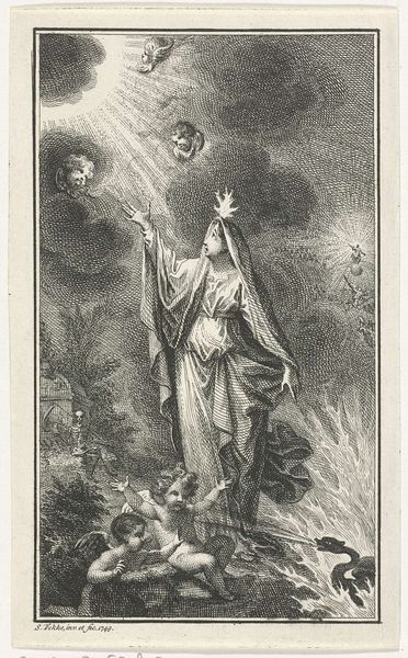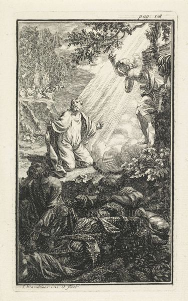This is an anonymous print depicting the "Vision of the Seven Lampstands." Here, the seven lampstands are potent symbols from the Book of Revelation, each representing one of the seven churches of Asia Minor, radiating divine light and vigilance. Note the figure of Christ, illuminated and central, standing amidst these lampstands. His outstretched hand holding seven stars, further reinforcing the idea of heavenly guidance. Observe the kneeling figure, likely John, overwhelmed by this divine revelation. This awe-struck posture, with hands raised in supplication or shock, echoes gestures found in ancient depictions of epiphany, like those of Emperors in Roman art. The gesture, passed down through time, continues to evoke profound emotional states. The power of this image lies in its ability to tap into our collective memory, evoking the sublime and the fearful, reminding us of the cyclical nature of prophecy and its eternal return.