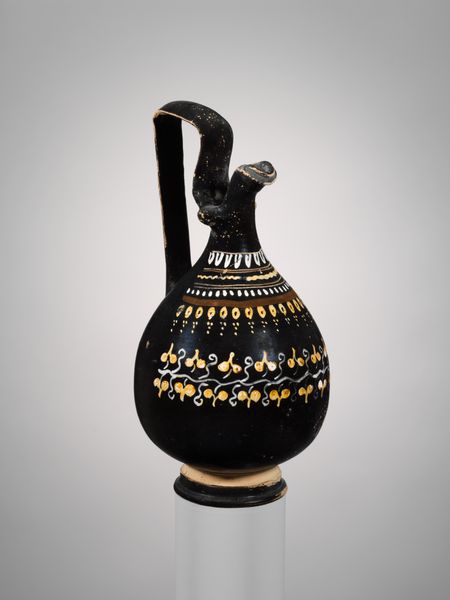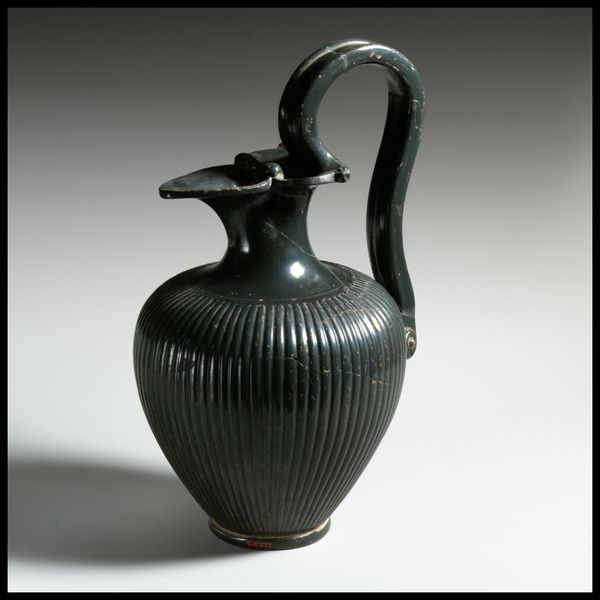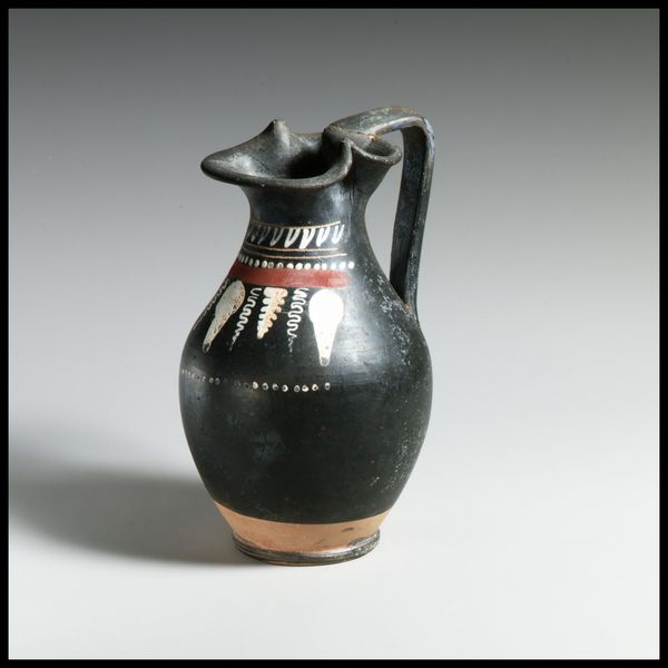 This oinochoe, or jug, in the collection of the Metropolitan Museum of Art, captivates with its lustrous surface and elegant form. Crafted by the Knudsen Group from terracotta, it stands as a testament to the sophistication of ancient pottery. The jug's body swells gracefully from a slender base, culminating in a refined spout and handle that loops with purpose. Its black gloss contrasts with delicate, stylized floral motifs, creating a visual rhythm that invites closer inspection. Note the distribution of motifs and decorative bands; these features emphasize a sense of order and balance. The composition demonstrates a clear understanding of form and negative space. This creates a harmonious interplay between the object’s shape and the decoration that adorns it. The jug serves as a practical vessel and an embodiment of cultural aesthetics. It speaks to the enduring human quest for harmony and beauty in the everyday.