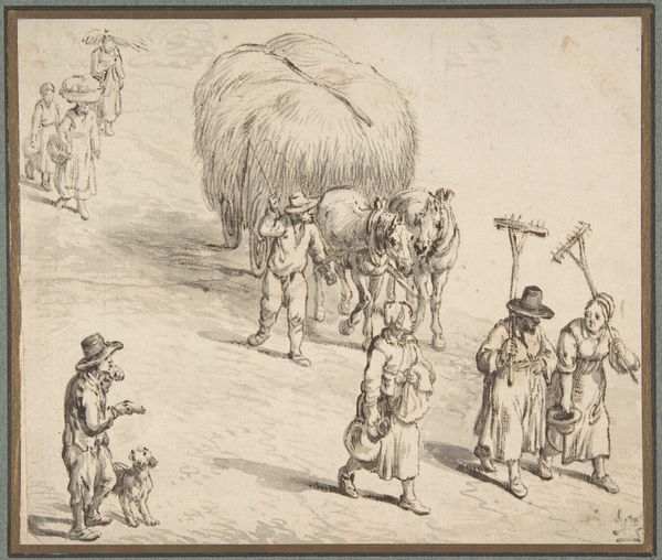 Curator: Here we have Johann Adam Klein's "Wallachian Wagoners Resting," a pencil drawing dating from around 1813. It’s a scene filled with such quotidian detail. Editor: My immediate impression is of stillness. The subdued pencil strokes create a scene almost caught between breaths, as though the world paused briefly to let this moment unfold. Curator: Klein’s interest in capturing everyday life is evident here. "Wallachian Wagoners Resting" depicts traveling workers at rest. This image fits into a larger fascination with portraying working-class people in their environments during the late 18th and early 19th centuries. How does this portrayal strike you, considering the symbolism of rest? Editor: Rest, particularly for itinerant workers, holds multiple layers of meaning. There's the obvious physical necessity but it can also carry symbolic weight. Note how Klein clusters his figures in a sort of pyramidal shape reminiscent of traditional religious imagery, though re-contextualized for everyday laborers. This imbues the ordinary with significance. Curator: That's an intriguing observation about the composition’s pyramidal structure mirroring religious art traditions, I must agree. Klein created this drawing at a pivotal time in European history. Social upheaval and the rise of nationalist sentiments were reshaping the political landscape, I can imagine how that may have shaped Klein’s perception of daily life. Editor: It does. Notice the subtle symbolism embedded in the Wallachians' attire—their hats, their relaxed postures, even the details of their tools. Klein seems to be hinting at both individuality and shared cultural heritage. It suggests a connection to the land, but also their independent spirit as journeymen. Curator: It is amazing how he was able to translate such nuanced meaning from what may seem to be a simple scene on the surface. Editor: I agree, there's so much more to it if you dig a little deeper!