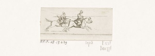 Editor: Here we have Daniel Chodowiecki's "Two Galloping Cossacks with Lances," a pen and ink drawing on paper from 1769. The figures seem to race across the page. What do you see in this piece? Curator: Beyond the surface depiction, I see a fascinating glimpse into the cultural imagination surrounding the Cossacks at that time. Notice the artist's choice to render them in mid-gallop. Does this suggest an idealized vision of freedom and speed, attributes often associated with Cossack identity? Editor: So you’re saying it’s less about a realistic portrayal, and more about representing ideas about the Cossacks? Curator: Precisely. Consider the lance. It isn’t just a weapon. It's a symbol of power, skill, and a very particular cultural memory. In 1769, what did the image of a Cossack represent to the people viewing this artwork? What anxieties or aspirations did it evoke? Think about the political landscape and cultural trends of that era. What do you think? Editor: I guess they could have been seen as both threatening and romantic figures, maybe symbols of rebellion and independence against empires. I never considered how the image itself could hold so much cultural weight. Curator: Indeed. Images are rarely neutral. Chodowiecki, through line and form, consciously or unconsciously, tapped into a reservoir of pre-existing cultural meanings. We carry generations of assumptions that surface in visual codes. Editor: I hadn't thought about it that way before; how symbols within art accumulate meaning over time. Curator: Understanding those accumulated layers is essential. The lances, the horses, the galloping—they all speak to a deeper cultural narrative. It makes you wonder, doesn't it, what meanings we unknowingly imbue in the images we create today?