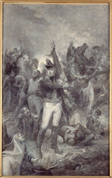 Editor: John Trumbull’s oil on canvas from circa 1797, titled “Lieutenant Thomas Grosvenor and Servant,” feels immediately like a scene plucked from a grand adventure— a slightly chaotic one, judging by the fallen figure at Grosvenor’s feet. What leaps out at you when you look at this work? Curator: Oh, adventure indeed! But, perhaps, a touch more complicated than just derring-do. I'm immediately drawn to the implied relationship, fraught as it might be, between Grosvenor and his…attendant. What is their connection in this tumultuous scenario? The servant almost seems to be both protecting and being protected. I wonder what it tells us, not just about these men, but about the era’s social dynamic. Notice how the servant is positioned slightly behind Grosvenor, armed, but his gaze seems to hold both alertness and a certain apprehension. Does Trumbull want us to see the implied tensions? Editor: That's fascinating; I hadn’t considered the subtleties in their dynamic. I was caught up in the sword and the battlefield. But thinking about it now, it's clear that the relationship goes deeper than mere master and servant. Curator: Absolutely. Think about the societal norms of the time and Trumbull, even if subtly, presents an ambiguous vision. There is, on the one hand, protection from the attendant. Yet Grosvenor clearly benefits and maintains position because of these dynamics. Is it possible that their intertwined fates on this “adventure” transcend those norms? Editor: It makes you consider all the stories layered beneath the surface of what seems, initially, just a historical portrait. I’ll certainly carry a different understanding of this artwork. Curator: Excellent! I think that’s the key; that initial glance can give you narrative, but digging for social tension adds complexity, transforming art from simple imagery to nuanced historical exploration!