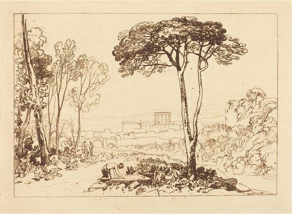 Curator: It has this wonderfully dreamy quality, doesn’t it? Editor: Indeed. Here we have J.M.W. Turner’s etching and engraving, "Apuleia in Search of Apuleius", from his Liber Studiorum, dating from 1813 to 1823. Curator: "Search" feels apt. The line work is so delicate it almost dissolves…the eye really does wander to find purchase. What I find interesting, though, is its unfinished state...it invites the viewer to almost complete it in their own mind. Editor: The material aspect is fascinating here. As a print, the labour involved, the reproducible nature challenges our assumptions. The copper plates themselves, the acid biting into them to create the lines, were all part of a very tangible process. Were these made for popular consumption? Were these easily affordable for a rising middle class? Curator: Possibly! To me, that slightly faded umber wash evokes nostalgia – perhaps intentional, perhaps simply age playing its hand. Do you think the "romanticism" lies in the wistful, somewhat classical scene itself or the very materiality, the etching marks and visible human effort? Editor: Both! This is history painting, yes, but rendered with such a clear connection to the handmade. We are forced to consider Turner as not just an artist but also an entrepreneur using printmaking to build a popular audience for his landscapes. I see the figures almost secondary, integrated wholly into the land. Curator: That balance between industry and aesthetics… the very tension between art and craft becomes central here. I am particularly drawn to the shapes of those trees, mirroring the arches of the aqueduct or bridge behind, I get an emotional response; everything feels entwined and slightly haunting, a visual poem, I guess? Editor: Yes! Even this plate being "unpublished," a kind of behind-the-scenes view, emphasizes labour and decisions...the whole project highlights changing methods for the production and circulation of art. Ultimately, Turner gives us this feeling to look through it... Curator: Well put. It leaves one feeling almost voyeuristic. Seeing this little insight in a private art search. Thank you!
