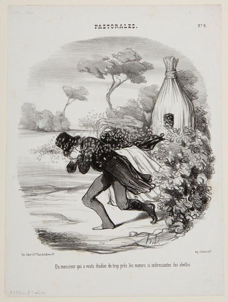 This lithograph by Honoré Daumier presents a scene of comical, chaotic retreat. Here, the bees, those ancient symbols of industry and community, swarm with an almost vengeful energy. Consider the motif of the swarm itself. From the Old Testament plagues to present-day horror films, the swarm embodies primal fears of being overwhelmed. The image resonates with deep-seated anxieties about nature's unpredictable power. Notice how Daumier captures the gentleman's desperate flight, a universal gesture of panic. We see echoes of this motif in various artistic traditions. Think of the bacchanals of ancient art, where wild abandon threatens to consume the individual. Daumier taps into this tradition, presenting a modern version of nature's uprising. The bees, no longer symbols of sweetness, become agents of chaos. This print reminds us that even the most diligent scholar can fall prey to the untamed forces of the natural world. A humbling lesson, indeed!