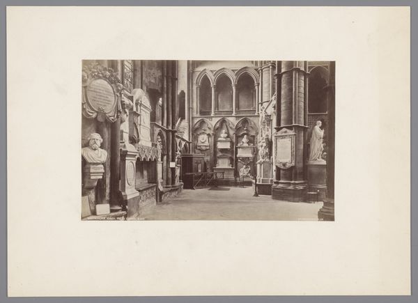 Curator: Before us, we have an albumen print by Médéric Mieusement, created between 1850 and 1900. It's titled "Zaal van Frans I van Frankrijk in het Musée de Cluny te Parijs" and comes to us from the Rijksmuseum collection. Editor: My first thought is how meticulously arranged and theatrical this scene feels, almost like a stage set. The soft sepia tones lend an aura of antiquated grandeur to the hall, drawing me into the past. Curator: Indeed. Mieusement was keen to capture these kinds of historically significant spaces. It’s worth noting that 19th-century photography, particularly in its use within museum documentation, shaped how the public understood historical spaces and artifacts. This wasn't merely recording; it was framing and interpreting cultural heritage. Editor: Absolutely, and I am struck by the recurring motifs: those intricate carvings on the furniture. It gives an impression of intertwined meanings, all pointing back to notions of royalty, legacy, and perhaps even specific mythologies of the French court. Curator: Yes, these symbols offer keys to interpreting the values and power structures inherent within that space. The Musée de Cluny itself, dedicated to the medieval period, presented a specific narrative of French identity, carefully curated and displayed. Editor: So, through those carefully posed artefacts, viewers may have gotten an impression about the aura of kings, or other authority figures, over time. Was this to solidify contemporary French national identity by visualizing its connection to, say, monarchic strength and sophistication? Curator: Precisely. These photographs were often circulated as postcards or incorporated into albums, effectively disseminating these narratives and reinforcing certain national narratives to an audience hungry for connections with their past. Editor: The photograph feels much more significant now that you mentioned circulation of albums. Considering its symbols and the medium used, it's a time capsule preserving not only a historic space, but the public's attitude toward this history, the identity that they're willing to remember and relive over and over again. Curator: And perhaps even forget or reimagine parts of. After all, every selection and presentation of heritage inevitably involves choices about what is remembered and what is obscured. Mieusement's image stands as a fascinating document, revealing much about the interplay of history, photography, and national identity in 19th-century France.
