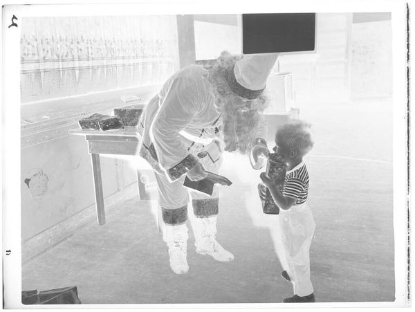 Editor: Here we have an untitled photograph by Martin Schweig, showing a child meeting Santa. It feels like a slightly awkward family moment. What do you see here? Curator: The Santa figure looms large, doesn't it? Consider how Santa, over time, has evolved from a religious symbol to a commercial icon. Note the child’s tentative posture, perhaps mirroring a broader cultural negotiation with these evolved traditions. Editor: So the image captures a tension between tradition and modern experience? Curator: Precisely. Even the negative image emphasizes a sense of something inverted, or reversed. Schweig seems to ask: What is the underlying truth about these symbols we embrace? Editor: I never thought of it that way, but it makes the picture a lot more interesting to me! Curator: Indeed, it invites us to question the emotional weight and cultural memory embedded in even seemingly simple scenes.