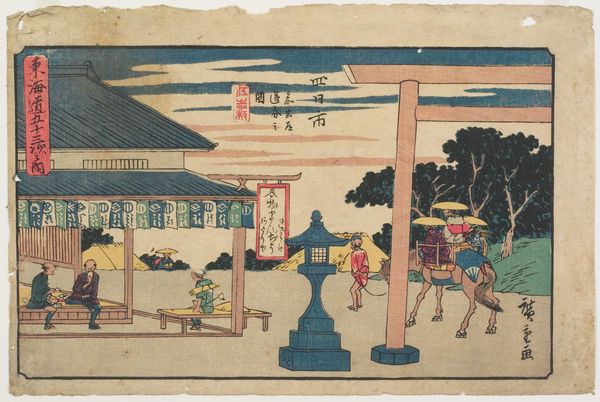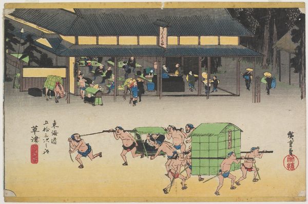 Editor: Here we have "Challenging the Guards," a woodblock print by Utagawa Hiroshige, created sometime in the 19th century. The tension in this print is palpable; what's your read on this confrontational scene, in terms of societal power dynamics? Curator: This work offers us a fascinating glimpse into the complex social strata of 19th-century Japan, specifically how power was both performed and challenged. Consider the assertive stance of the guards contrasted with what appears to be a collective defiance from the approaching group. The guards likely represent the established order, protecting the interests of the elite, but I would venture to suggest the approaching group represents a populace grappling with its own subjugation, ready to question and even resist this enforced authority. How do you interpret their body language? Editor: They certainly don’t appear to be backing down, there's an energy to their advance. Is this a typical theme in ukiyo-e prints? Curator: While landscapes and depictions of the courtesan world are dominant, this subtle interrogation of power isn't entirely uncommon. Think about how Ukiyo-e, as a genre accessible to the merchant class, served as a space to potentially question the status quo held by the Shogunate and samurai classes. Hiroshige is prompting us to consider not just what we see, but what isn't readily apparent, what underlies the performance of power. This work isn't just a pretty landscape with figures; it's a narrative ripe with potential resistance. It makes us think, doesn’t it, about who holds the power, and how easily that can be upturned. Editor: That's an important nuance I missed! I appreciate seeing the print not only as a historical record but also as a catalyst for understanding cultural critique. Curator: Precisely, and how visual culture can both uphold and challenge established hegemonies, then as well as now.