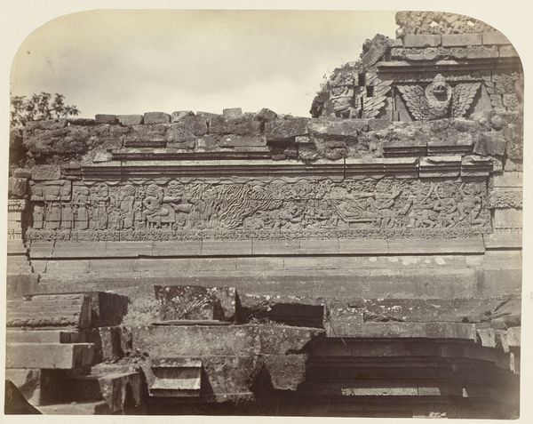 This albumen print depicts the bas-relief of Krishnayana on the east side of Candi Panataran and was created by Isidore Kinsbergen. Kinsbergen, a Dutch-Jewish printmaker, lithographer, and photographer, made it his mission to document the cultural artifacts of Java during the Dutch colonial era. Look closely at the bas-relief itself. It presents a narrative, a sequence of moments frozen in stone. Each figure, each gesture, tells a part of the story of Krishnayana, a Javanese poem based on Krishna's life. Kinsbergen doesn't just document; he interprets, framing the temple, the bas-relief, and the stories they contain, within a colonial gaze. Consider the layers of representation: the original carvings, imbued with cultural and spiritual significance, captured by a European photographer, and then viewed by us, today. This photograph invites us to reflect on the complex interplay of culture, representation, and history. It offers a glimpse into the past, and prompts us to think about how we understand and interpret the stories of others.