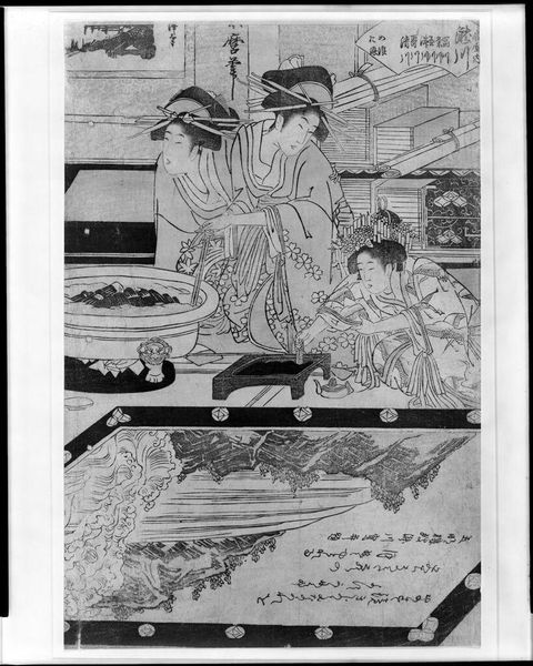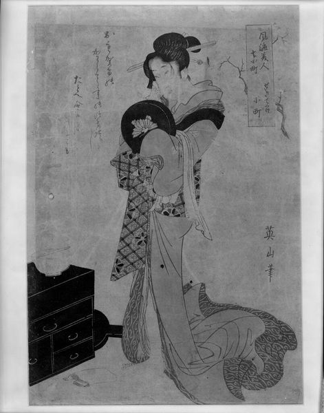Editor: Here we have Kubo Shunman's "Courtesan and Attendants Beneath Cherry Blossoms," a print on paper. It feels very serene and composed. What stands out to you about this piece? Curator: I'm struck by how Shunman depicts the courtesan and her attendants. Their presentation signifies societal expectations, doesn't it? How might their clothing and stylized movements reflect the limited roles available to women at the time? Editor: I see what you mean. They seem almost frozen in place. What can this tell us about the agency of women in that era? Curator: Exactly. Notice the cherry blossoms. While beautiful, they are fleeting, ephemeral. Could they be a symbol of the transient nature of beauty or even life itself for these women? Food for thought, isn't it? Editor: Absolutely, I never considered the symbolism of the cherry blossoms in relation to the figures. Curator: These images prompt us to examine gender roles, societal expectations, and the ever-present negotiation of power, even within seemingly tranquil scenes.
