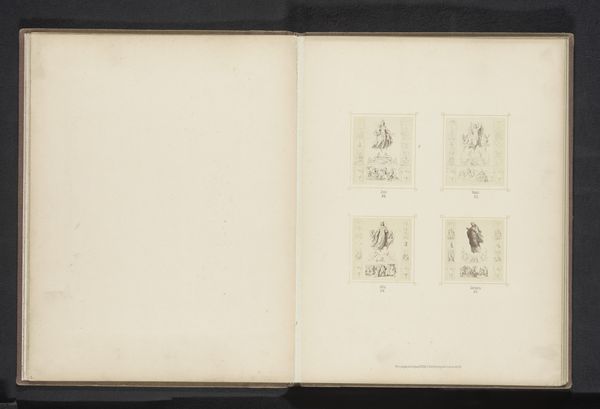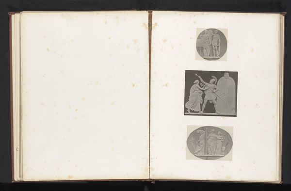 Editor: We're looking at "Zes fotoreproducties van een publicatie door de Arundel Society met prenten naar Giotto," dating from before 1869. It appears to be a photograph of a book page featuring reproductions of Giotto's work. The images are small and quite faded, giving the page a melancholic, historical feel. What stands out to you when you examine this collection of reproductions? Curator: Well, I'm immediately drawn to the fascinating dialogue between reproduction and the aura of the original. Consider Giotto: his frescoes were revolutionary in their emotional naturalism, forging a new visual language. The Arundel Society aimed to disseminate art to a wider British audience, so how do these photographic prints, themselves copies, function as cultural memory triggers? Editor: So you're suggesting that these prints act almost as relics, reminding us of Giotto's innovations? Curator: Precisely. Think about the emotional power Giotto imbued in his figures, the symbolic weight of each gesture. Now, imagine how that gets filtered through the printing process, the photographic lens, and ultimately, our own perception. Does the emotional core survive? Editor: That’s a good point. I wonder, in its own way, the limitations of the photographic reproduction also carries a meaning and affect? Curator: Exactly! It also raises an interesting question about the perceived authority of images, doesn’t it? Even a diminished image can act as a placeholder for deeper cultural narratives. What about the book format itself - does that shape how we respond? Editor: Absolutely. Presenting them as part of a bound volume lends a certain academic weight. Seeing these reproductions organized this way is entirely different from encountering Giotto's actual frescoes. I think that’s an element I hadn't considered. Curator: Indeed, the visual symbol persists. Ultimately, the book’s existence bears its cultural weight.
