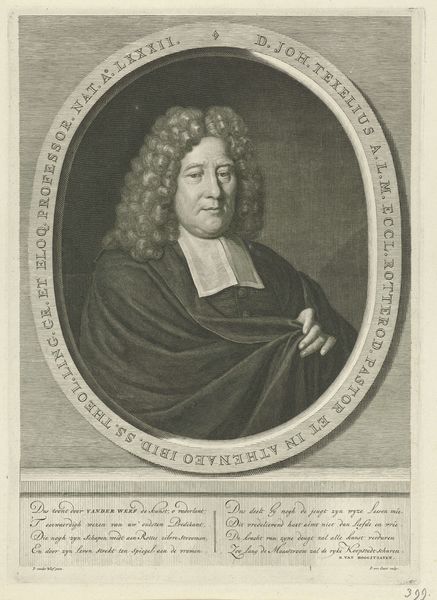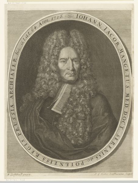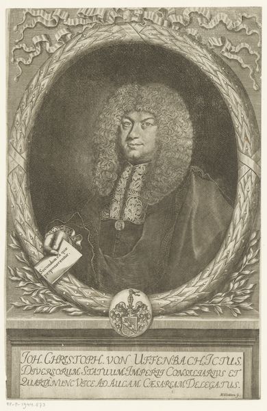 Editor: This is "Portret van Felix Spitz," an engraving located at the Rijksmuseum. It dates between 1664 and 1725 and is attributed to Christoph Weigel. The overwhelming sense I get is one of power—that wig is intense! What do you see in it? Curator: Indeed. That wig is everything! But it's not just a fashion statement. Consider the subject: Felix Spitz, a professor of feudal law. This engraving, therefore, is making a very specific argument. Weigel presents Spitz within the context of learnedness. Look at the deliberate framing of the portrait – what statement does that make to you? Editor: The oval frame and inscription below elevate Spitz, making him seem important. So, it's not just a portrait, but a statement about his societal position? Curator: Precisely! During the Baroque era, portraiture was frequently used as a tool for constructing and reinforcing social hierarchies. This engraving, therefore, doesn't merely depict an individual but embodies ideas about knowledge, status, and who had access to it. How might Spitz's profession and the artwork's date inform its cultural function? Editor: The Baroque style and his profession would likely appeal to the aristocracy, reinforcing their sense of superiority by seeing someone they consider their equal honored in such a way. Curator: Yes, absolutely. It acts as visual propaganda, reinforcing a social order that benefited a select few. The visual language—the wig, the frame, the inscription—all contribute to constructing this image of power. Food for thought. Editor: I see now; the portrait isn't just about Spitz; it reflects the power structures of his time. It's been incredibly insightful. Curator: And the awareness of historical context makes all the difference!