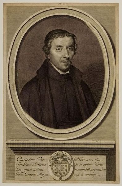 Curator: Here we have William Bouguereau's "A Portrait of Eugene Bouguereau," painted in 1850. It is currently held in a private collection. Editor: The first thing that strikes me is the stark contrast. The dark, almost severe clothing against that pale, slightly sickly complexion, all framed within this soft, blurred oval. Curator: The framing is quite typical of portraiture from this period. What is interesting is that the sitter's direct gaze feels confrontational but still within academic conventions of depicting character and status. As a member of the clergy, it shows how institutional power can still convey humanity. Editor: Power is such an abstract idea, here rendered through very physical means. The layers upon layers of oil paint, building up these almost imperceptible shifts in tone...that's real work, isn't it? The labour involved in portraying status! It’s worth remembering all the material concerns – pigment recipes, brushstrokes, the stretcher for the canvas, the lighting in the studio -- which come together to give this impression of power. Curator: Absolutely. It is also worth remembering the historical climate in France in the 1850s. Louis-Napoleon had only recently seized total power. Academic painting had a critical role in maintaining a status quo that presented power as virtuous. Editor: But the subject's eyes, they don't project confidence. I see a hint of vulnerability or perhaps a questioning spirit. Was he fully at ease within that status? Curator: Perhaps the very act of commissioning a portrait like this can also signify a form of social positioning or aspiration. It provided sitters such as Eugene agency to represent themselves favorably but within acceptable, almost conservative parameters. Editor: And for us today, it opens up this conversation about the creation of image and the role of representation itself in how the clergy positioned themselves within a quickly changing world. This feels so rich. Curator: Agreed, seeing how political forces and art are intertwined, each shaping and informing the other. Editor: Definitely given me a lot to consider about the weight of this picture as an object and its making, as well as the labor that went into it and who controls it.